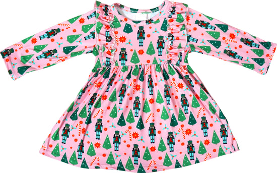 When your little one wants to twirl through the dance of the Sugar Plum Fairy, they'll look grand in this Nutcracker Ballet Pink Ruffle Dress! It's made from a blend of cotton and spandex for a comfortable fit, and features all the festive trimmings you need with its Christmas-themed nutcracker and ruffles. It's the perfect dress for festive fun or sugar plum daydreams! True to size. Knit Cotton & Spandex blend
