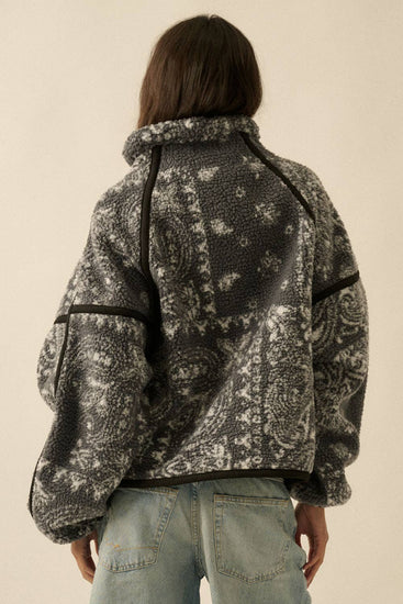 Stay cozy and stylish with our Bandana Sherpa Fleece Half-Zip Pullover Jacket. Featuring an allover abstract floral print and dropped shoulder, this relaxed fit jacket is perfect for adding a pop of fun to your winter wardrobe.