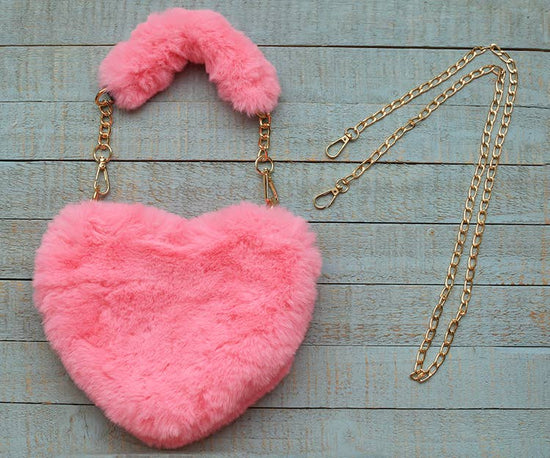 Cute furry purse shaped as a heart. so soft. lined, zipper, and shoulder strap. Also comes with gold chain crossbody strap. Great for everyday wear and for Valentine’s Day too. So great for everyday wear and photo's! Can be paired with our tutu's, hats, tees, tanks, sweatshirts, sunglasses, bracelets, necklaces, clips and headbands! Create an outfit and make it your own!