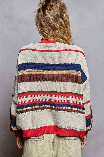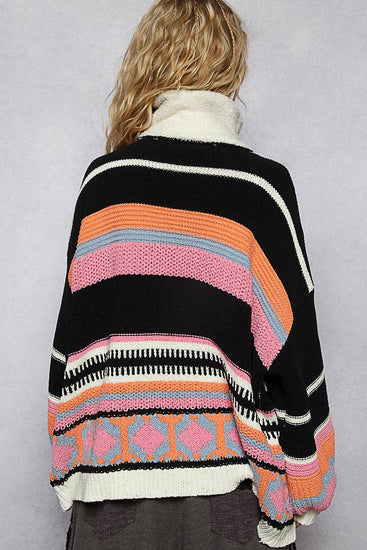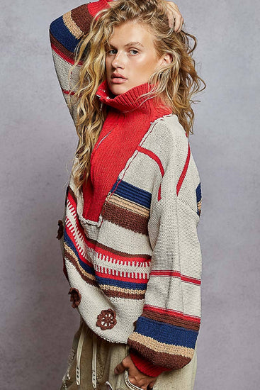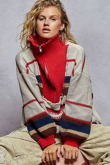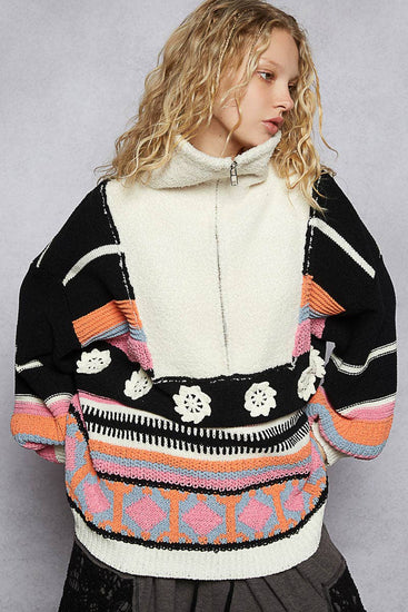 Designed in half zip up, balloon sleeve, roomy fit top in chenille sweater with outseam edge and patch detail pointed striped pattern.