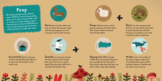 Related: scat, droppings, excrement, science, STEAM, nature, animals, habitats, lift-the-flap, ecosystem, rhyming, sloth, hippo, hippopotamus, whale, rabbit, bunny, dung beetle, insect, seagull, sheep, gross, preschool, homeschool